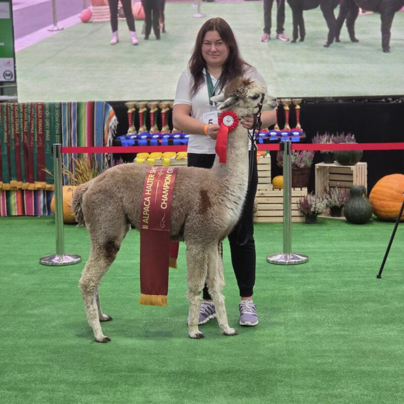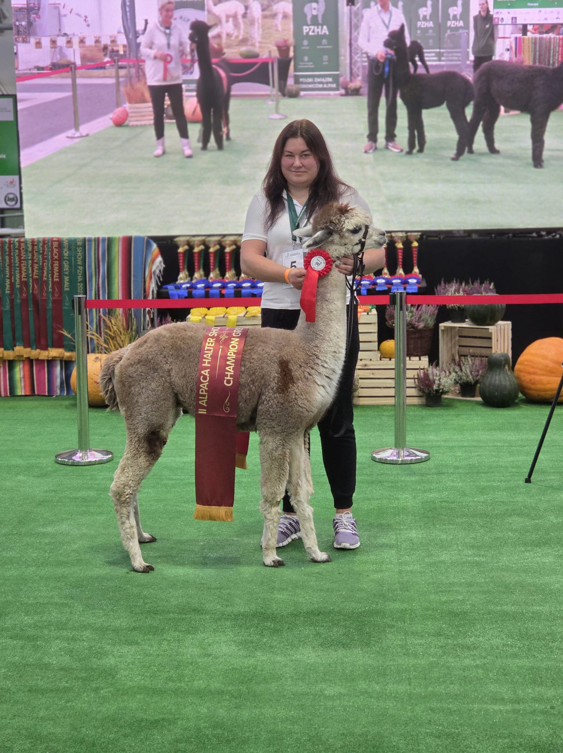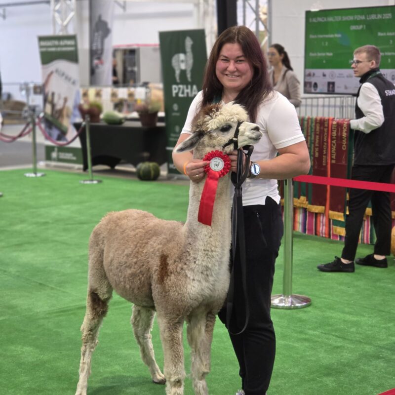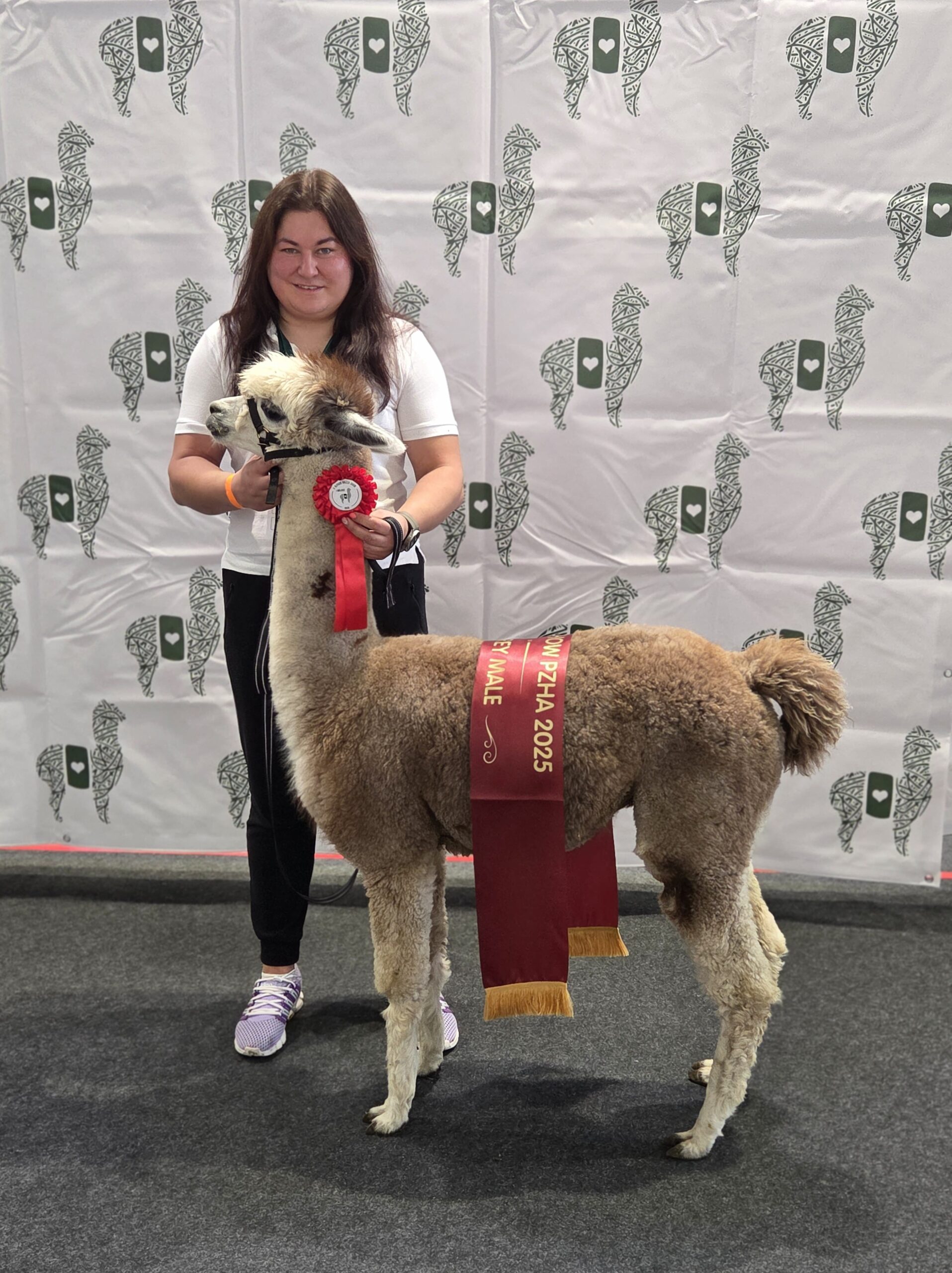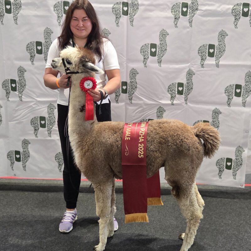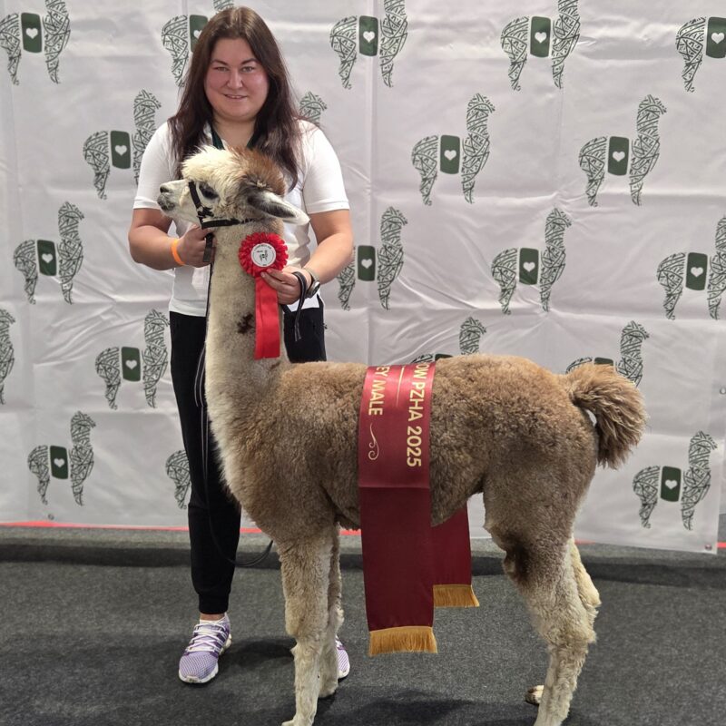 Lex`is ypatingai dailus vyras rose grey spalvos. Malonus, puikios vilnos. Apdovanotas Lenkijoje II PZHA National Alpaca Show, laimėjo 2025 metais Rose grey vilnos čempiono titulą.