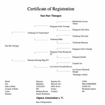 Timogenas jau įrodė savo neįtikėtiną vilnos kokybę, ypač tamsiai rudam gyvūnui. Be kitų pasiekimų, jis sukėlė sensaciją 2020 m. pavasarį, kai Graco alpakų parodoje buvo karūnuotas Jaunųjų rezervinių čempionų Huacaya patinu. Teisėją Rogerį Clarką ypač sužavėjo absoliutus aukšto dažnio gofravimo stiliaus vienodumas, akivaizdus visoje jo vilnoje, ir itin smulki tekstūra . Tai leido jam parodų ringe pranokti net šviesesnius gyvūnus, tokius kaip baltieji.